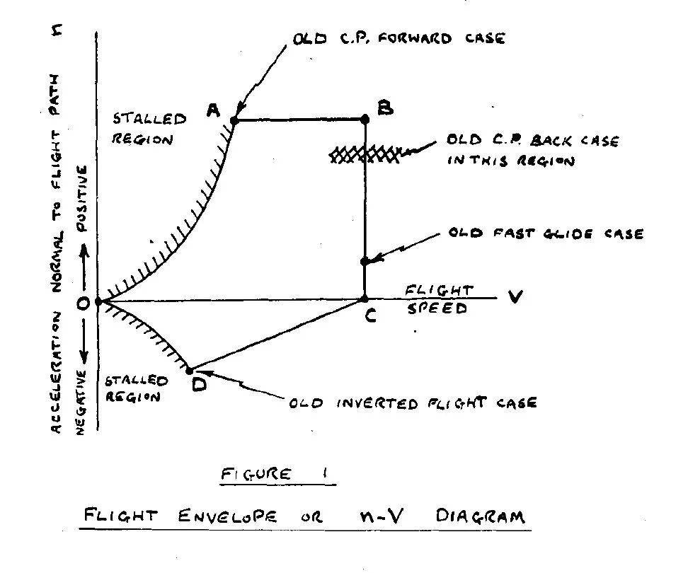The best known of the envelope cases is the “flight envelope,” which is in general use in this country and the United States. [...] The “flight envelope” covers all probably conditions of symmetrical manœuvring flight instead of the few isolated points specified in the previous system. It is based on the previously mentioned fact that the loads sustained in symmetrical manœuvres are mainly functions of the normal acceleration n and the flight speed V. Other variables, such as pitching acceleration, have only a secondary importance. We can therefore specify the whole range of symmetric manœuvres by drawing a diagram which defines the range on n and the range of V. Such a diagram, which is called an n-V diagram, is illustrated in Fig. 1. The line AB represents the highest expected normal acceleration: BC represents the highest expected speed, and point D the highest normal negative acceleration at low speed. The curved lines OA and OD represent the stall—it would be impossible to achieve a value of n above the line OA or below the line OB, because the wing would be beyond its stalling incidence.